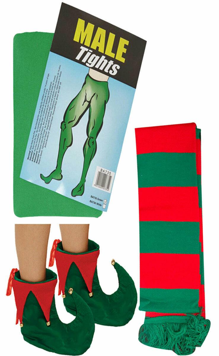 Male Tights Elf Shoe Covers Red Green Striped Scarf Christmas Xmas Fancy Dress
