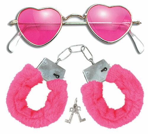 Pink Lens Hippie Heart Shaped Glasses with Fur Handcuffs 60's Fancy Dress