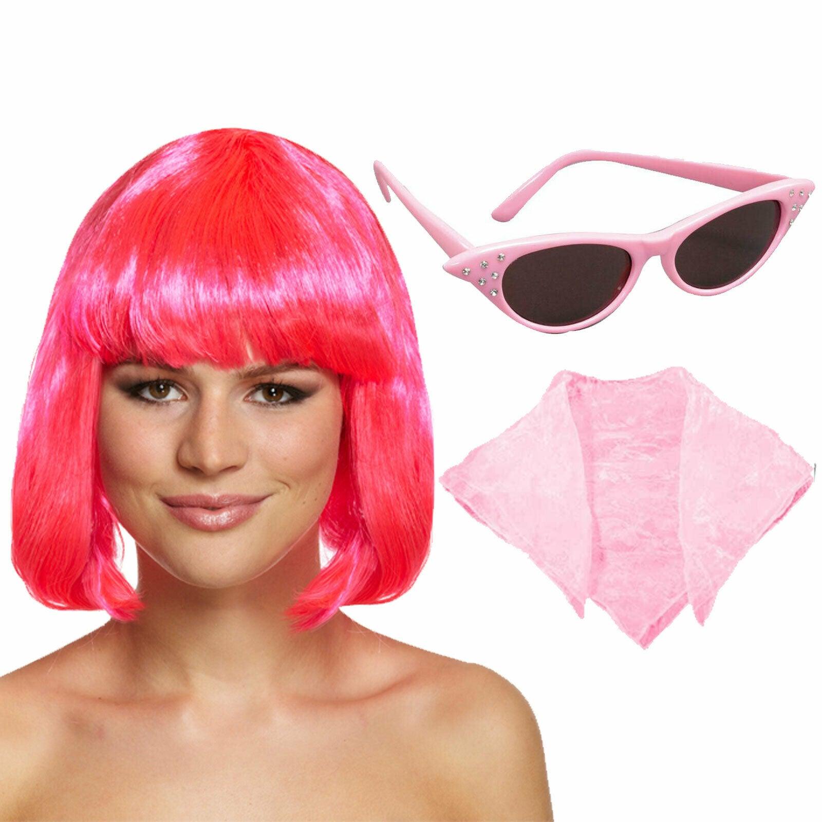 Pink Mid Wig Sunglasses Scarf 50’s Style Poodle Costume Hen Night Fancy Dress