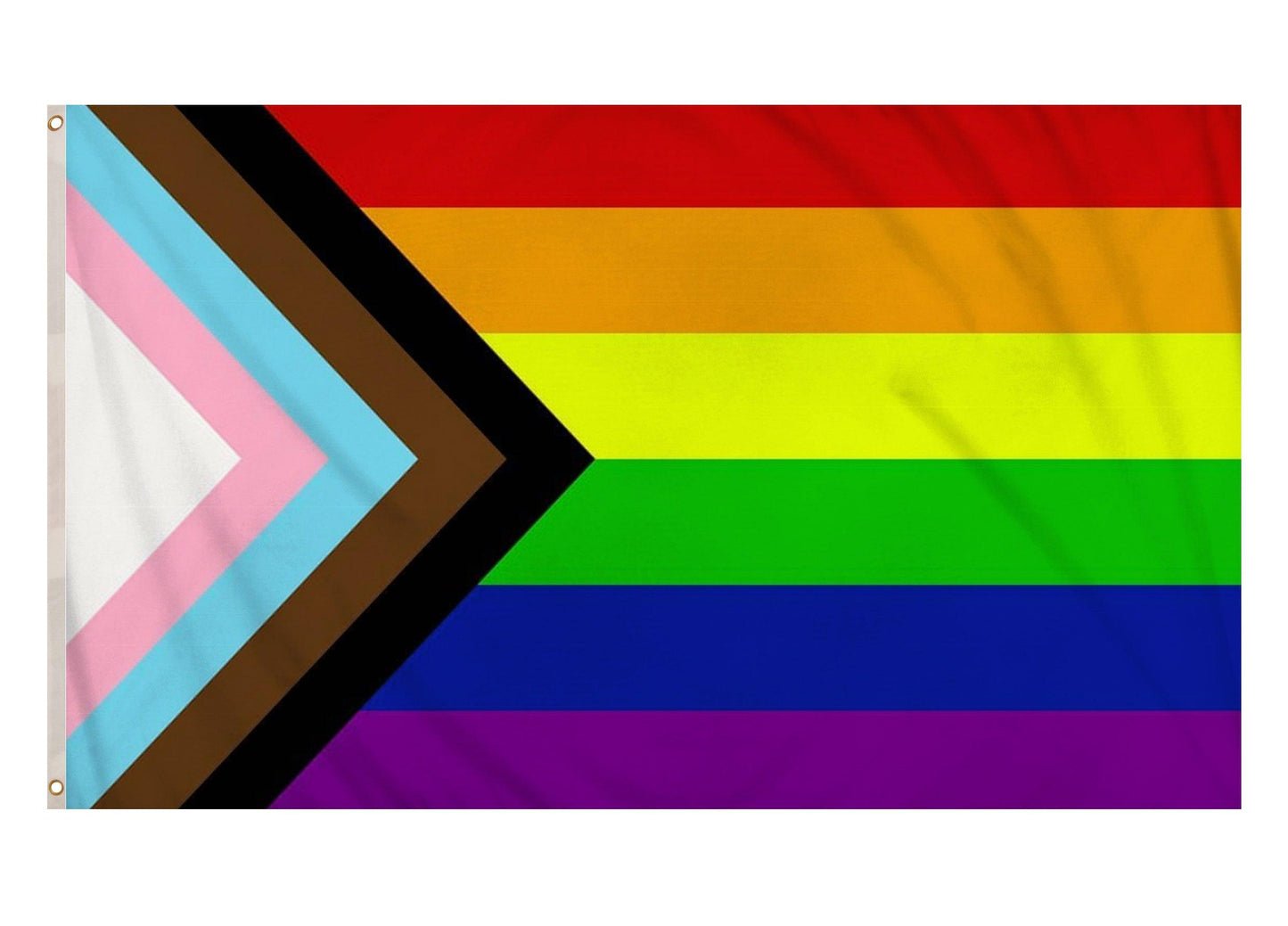 High-Quality Pride Progress Flag Made Of Durable Polyester Material With Double-Stitched Seams And Metal Eyelets For Secure Hanging.