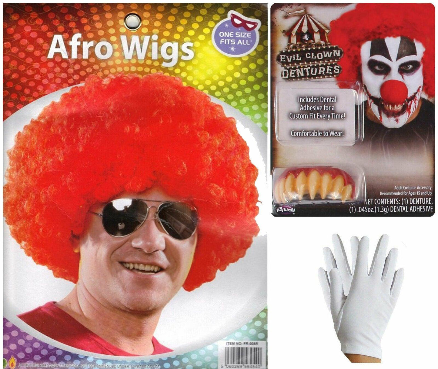 3 Pcs Set Includes: Red Afro Wig+ Clown Dentures + White Gloves