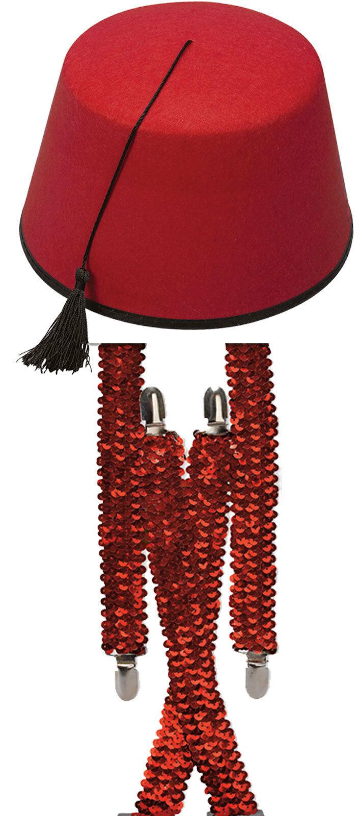 Red Plain Bow Tie Braces Fez Hat Moroccan Turkish Fancy Outfit Set