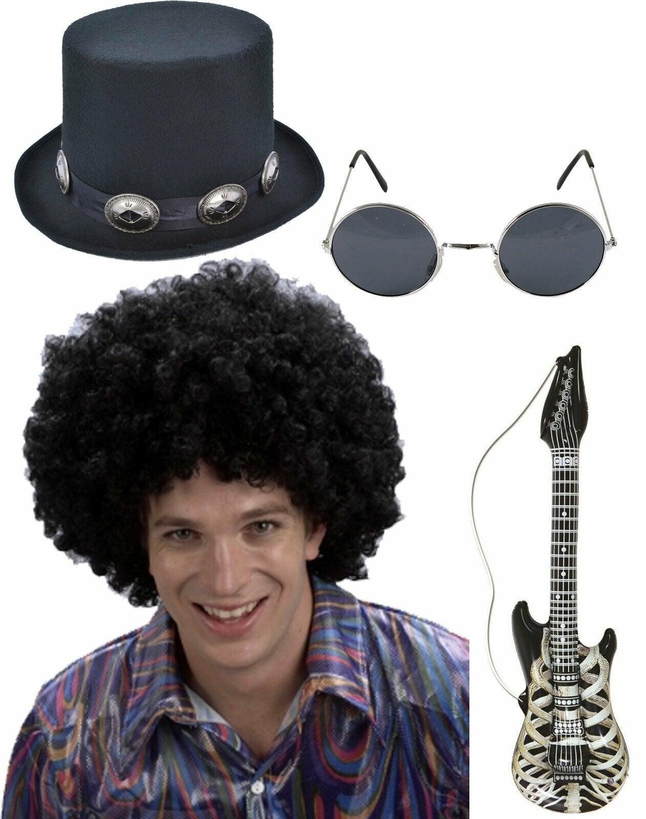 Rocker Hat Black Afro Wig Glasses Inflatable Guitar 1980’s Punk Rocker Fancy Dress