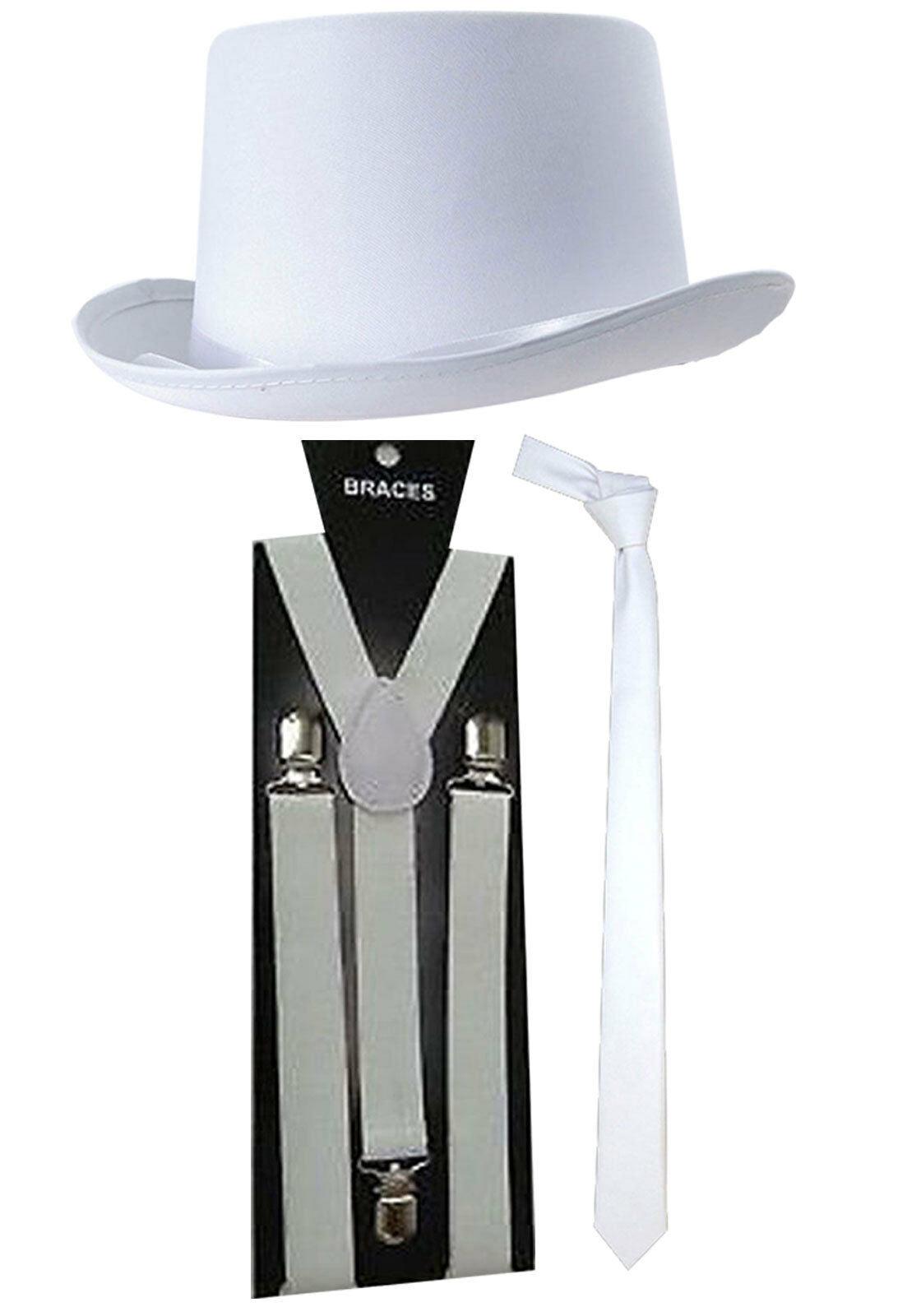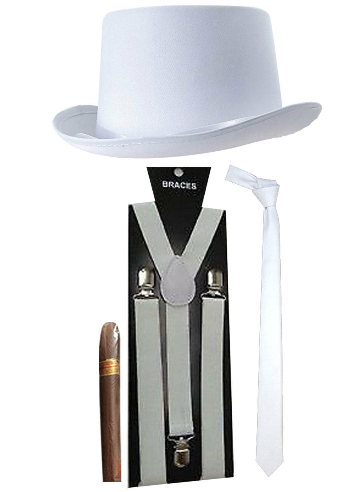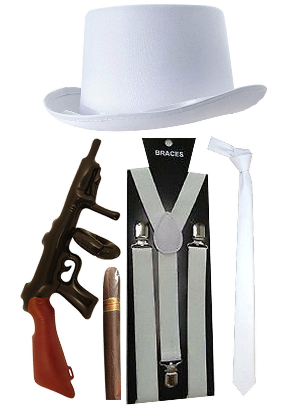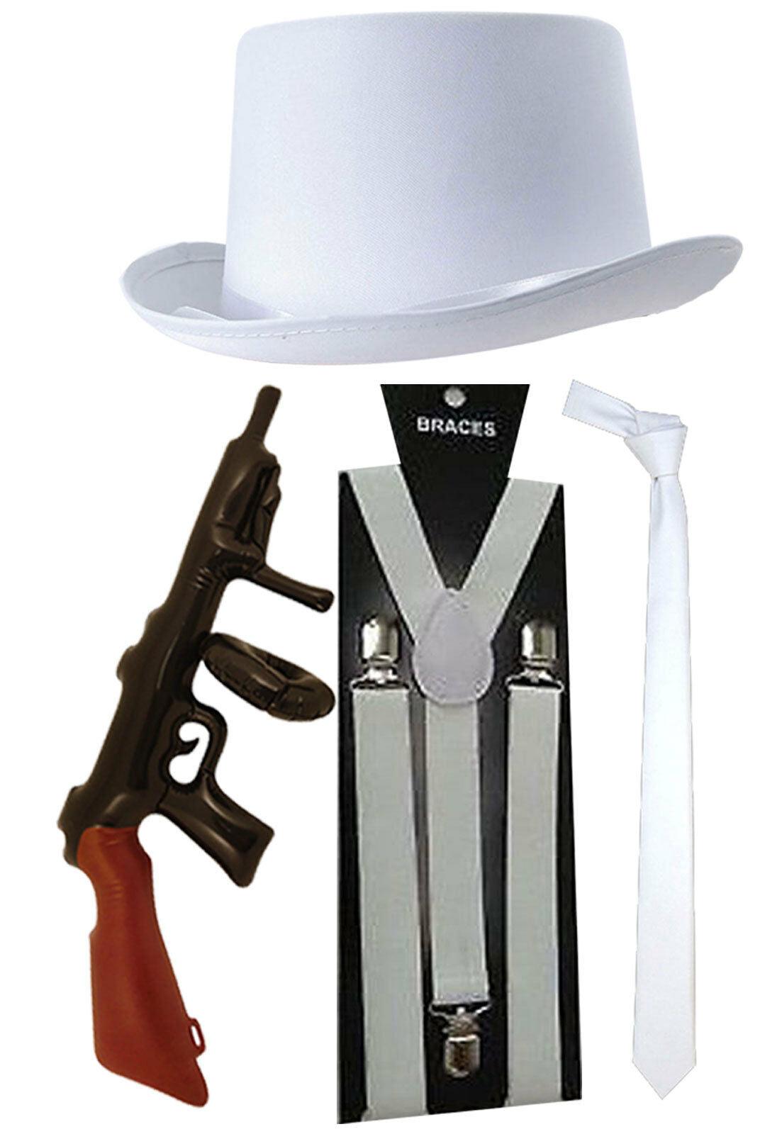 Satin White Hat Braces Tie Cigar Tommy gun Fancy Costume Accessories lot