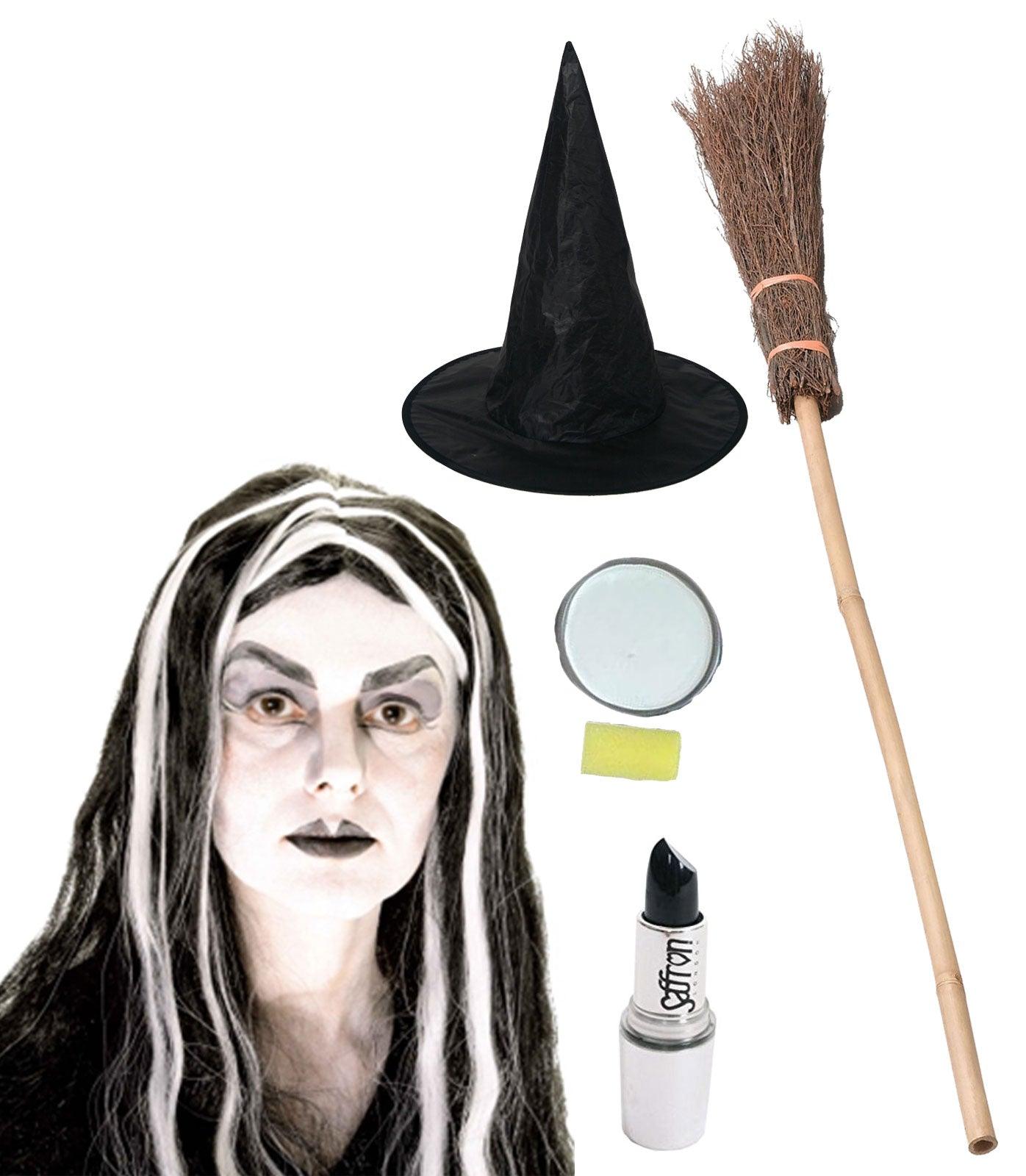 Scary Witch Fancy Dress Costume Set - Witch Hat, Wig, Broom Stick, Face Paint, Lipstick