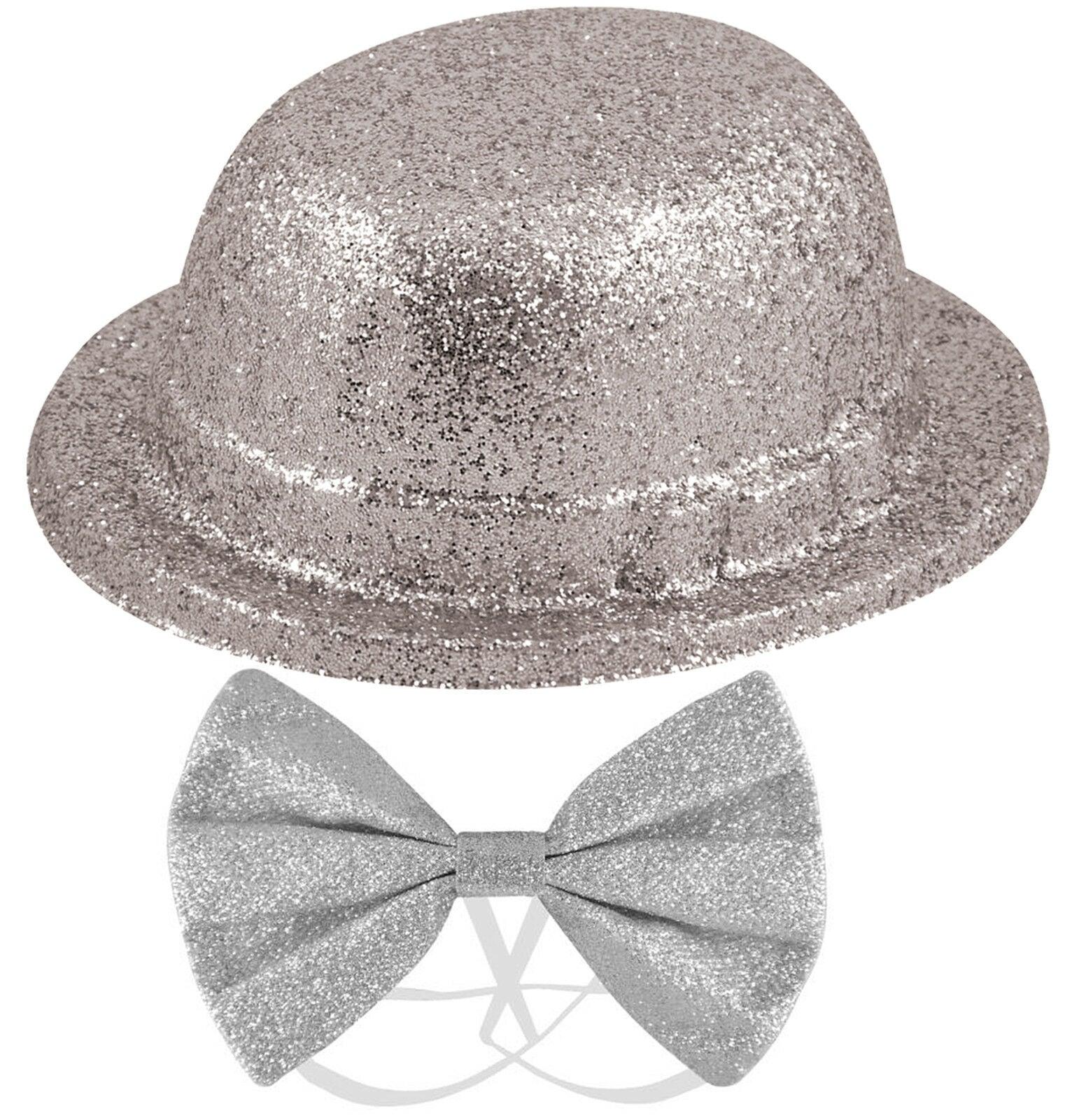Silver Sparkly Plastic Glitter Bowler Hat with Dicky Dickie Bow Tie Fancy Dress Set