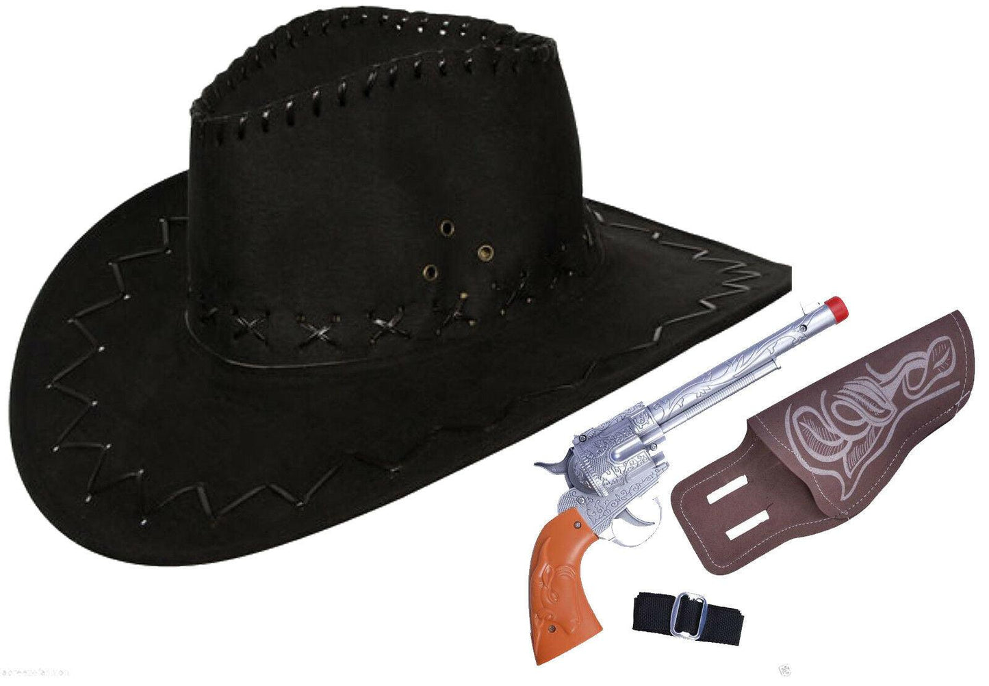 Suede Look Wild Western Cowboy Hat & Plastic Gun with Black Belt Fancy Dress Set