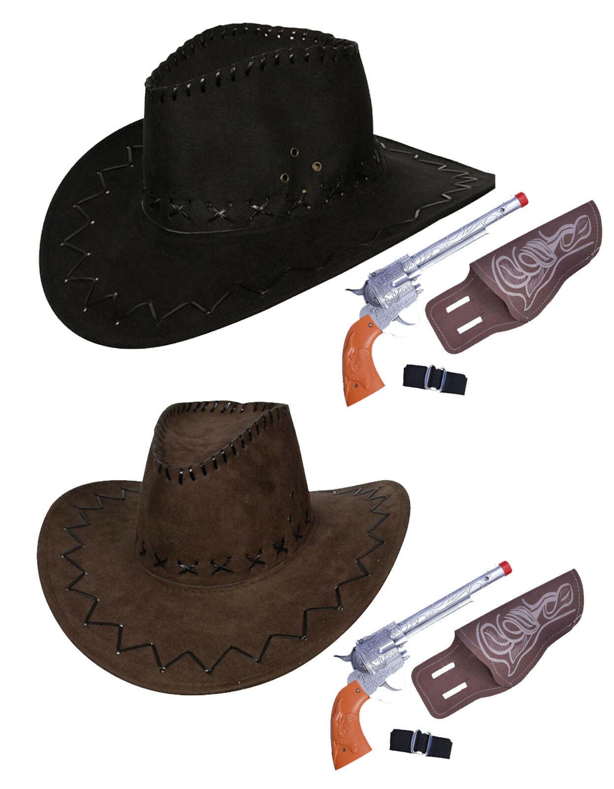 Items Includes: Brown Suede Look Cowboy Hat + Plastic revolver with leather look holster & small black belt