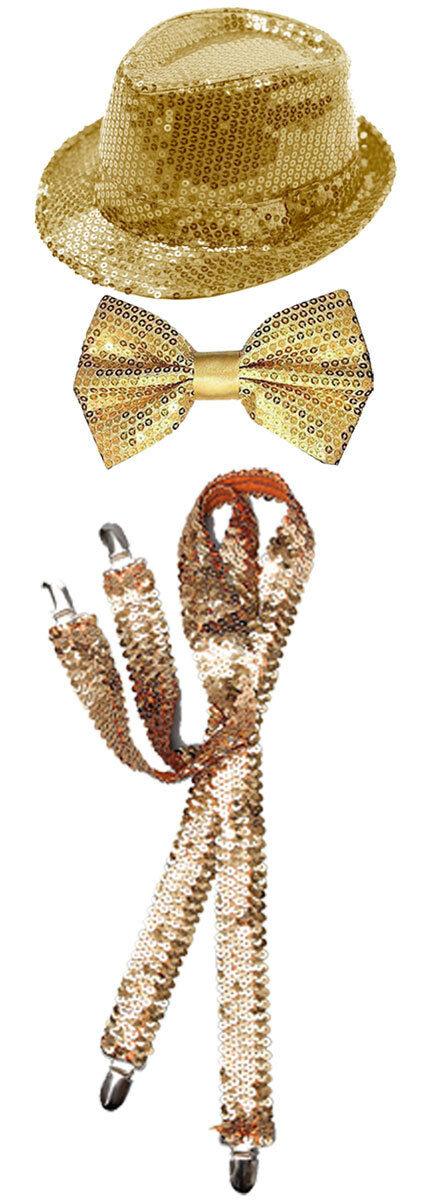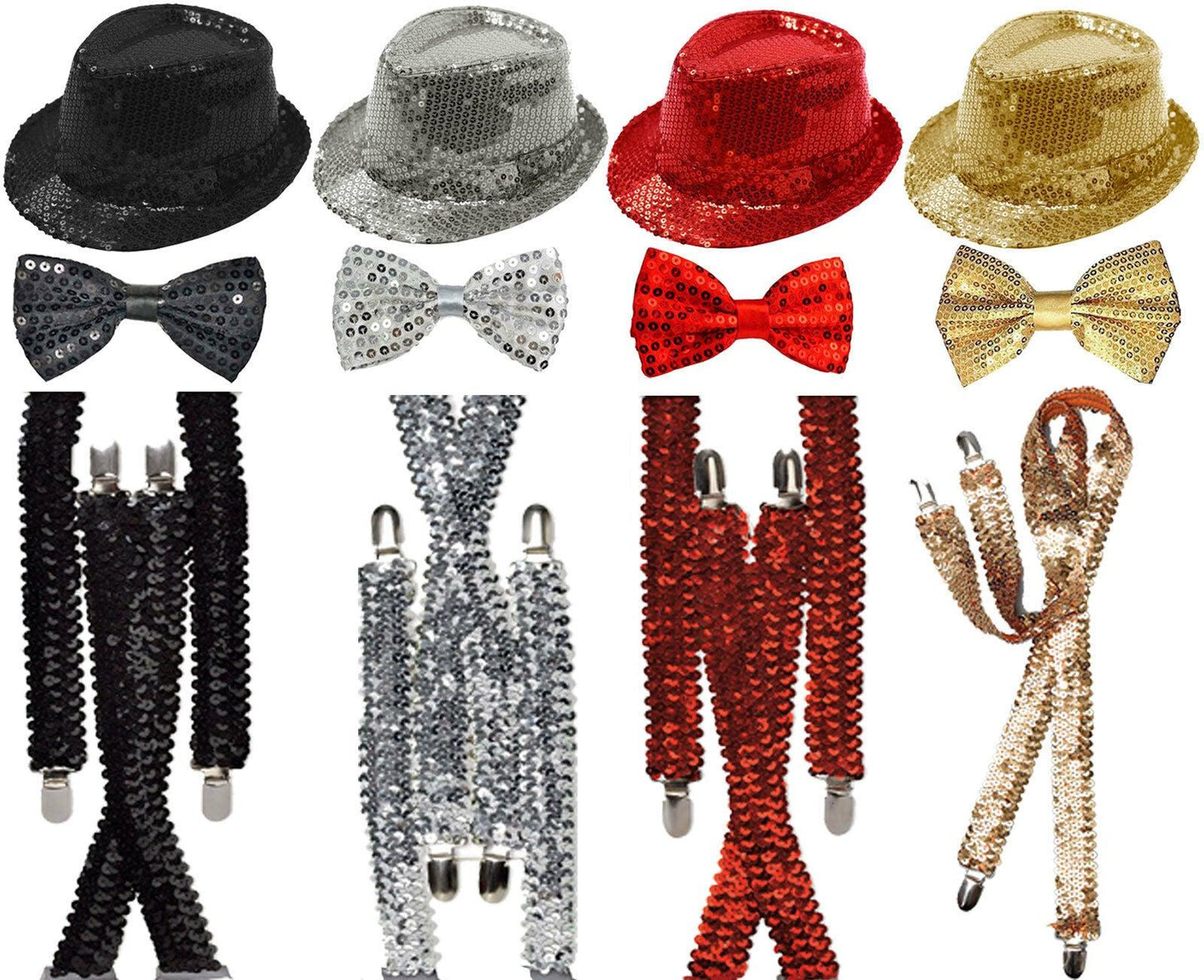 Unisex Sparkly Sequin Hat Braces Dicky Dickie Bow Tie Adults Fancy Dress Set