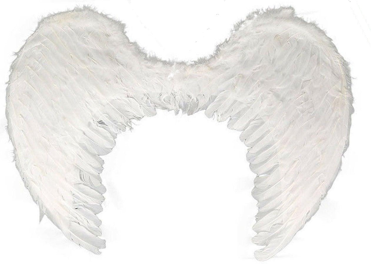 Large Feather Wings: A pair of elegant white wings with a wingspan of 80 cm and a height of 60 cm, fastened with elastic bands to be comfortably worn around your shoulders.